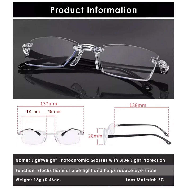 Con un peso di soli 13 g, questi occhiali ultraleggeri sono dotati di lenti che bloccano la luce blu e si adattano alla luce solare. Comodi da indossare tutto il giorno, riducono l'affaticamento visivo digitale e si scuriscono all'aperto per proteggere dai riflessi.